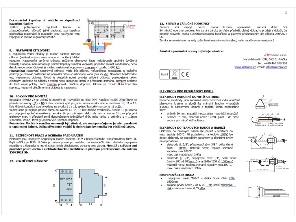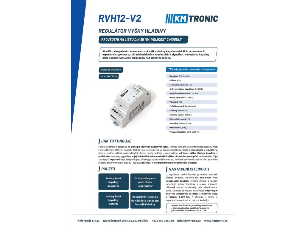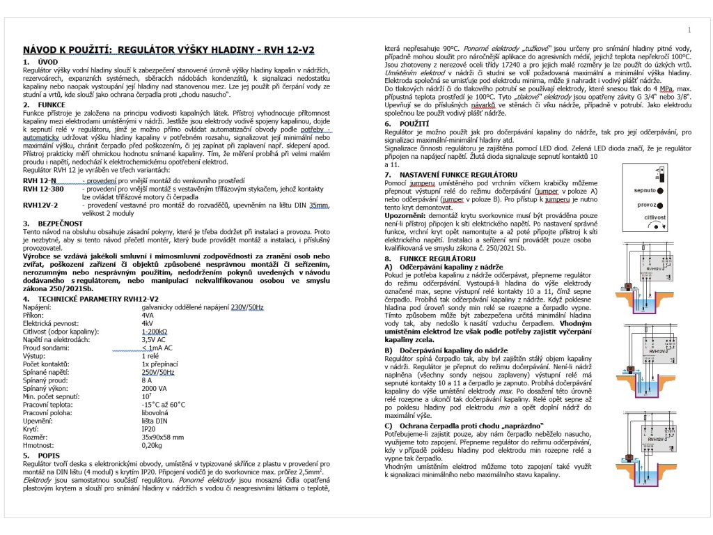 RVH12-V2: Regulátor výšky vodní hladiny slouží k zabezpečení stanovené úrovně výšky hladiny kapalin, k signalizaci nedostatku kapaliny nebo naopak vystoupání její hladiny nad stanovenou mez.